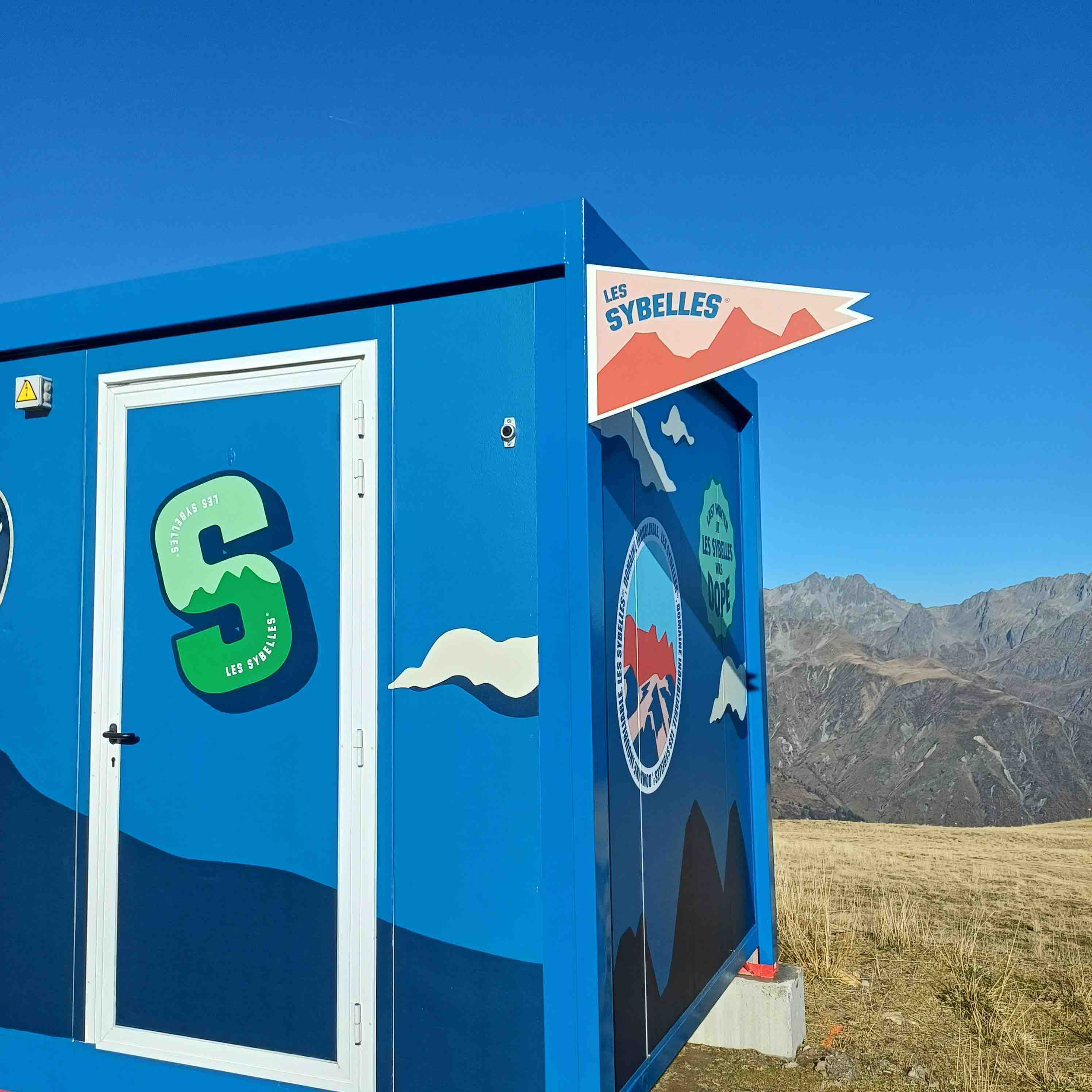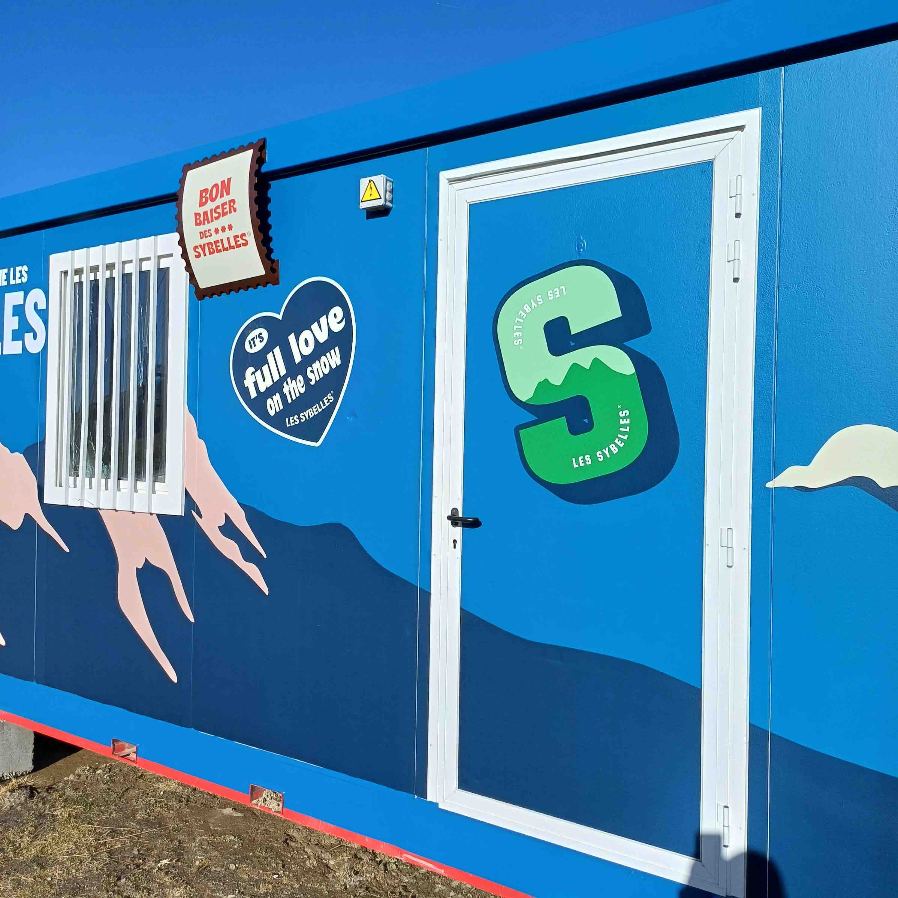 100 % personnalisation d'un algeco sur les pistes. Fabrication sur mesure de pièces en acier dans nos ateliers, pour donner du relief à la déclinaison de la charte graphique des Sybelles. Covering de la totalité de la surface de l'algeco par notre équipe de pose, adhésifs polymères imprimés sur les partie planes et adhésif teinté masse colle renforcée sur les montants.