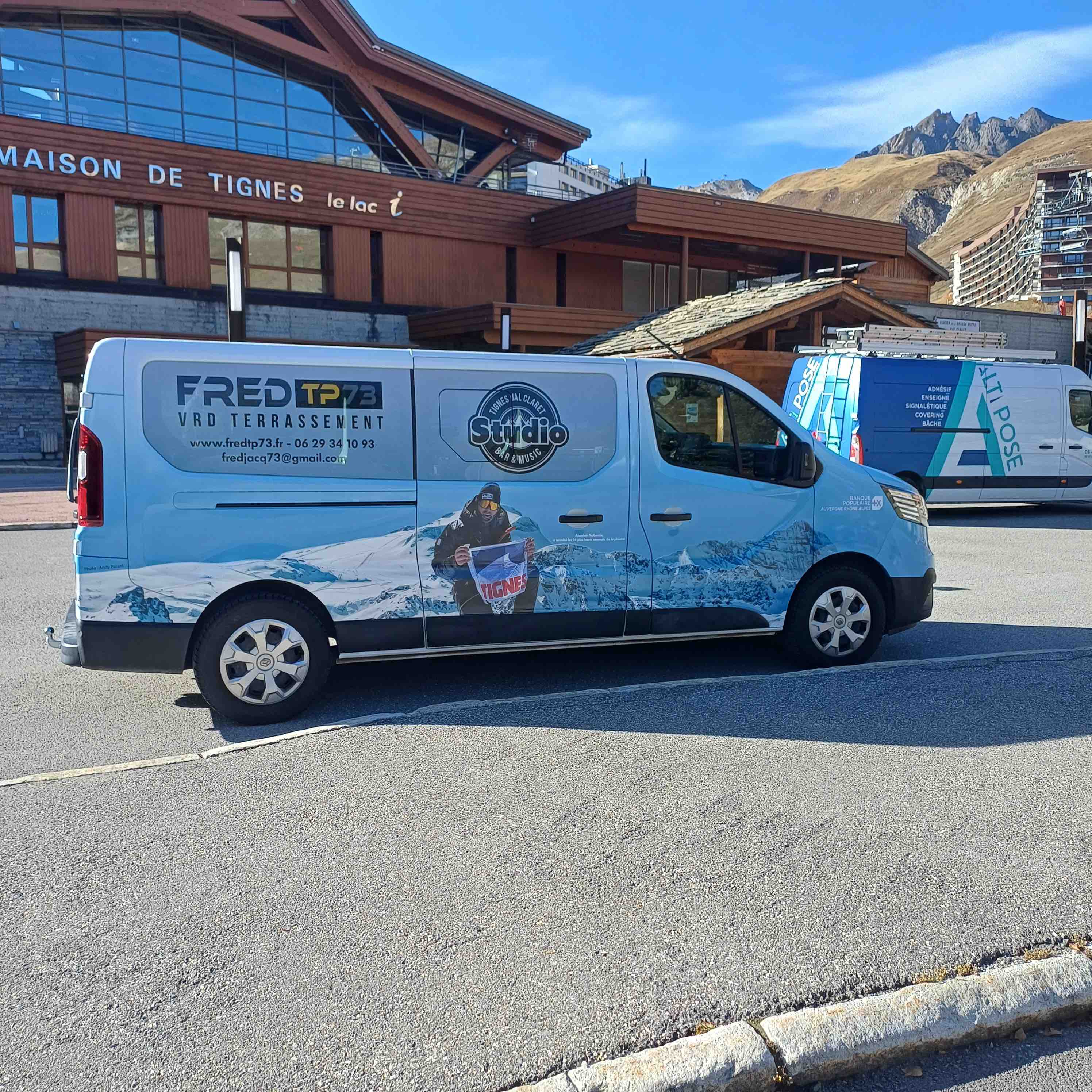 100 % personnalisation d'un algeco sur les pistes. Fabrication sur mesure de pièces en acier dans nos ateliers, pour donner du relief à la déclinaison de la charte graphique des Sybelles. Covering de la totalité de la surface de l'algeco par notre équipe de pose, adhésifs polymères imprimés sur les partie planes et adhésif teinté masse colle renforcée sur les montants.